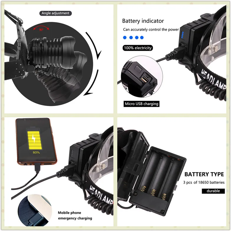 Best Seller Powerful 8000LM XHP70.2 LED Headlamp USB Rechargeable Headlight Waterproof Zoomable Power Bank Fish