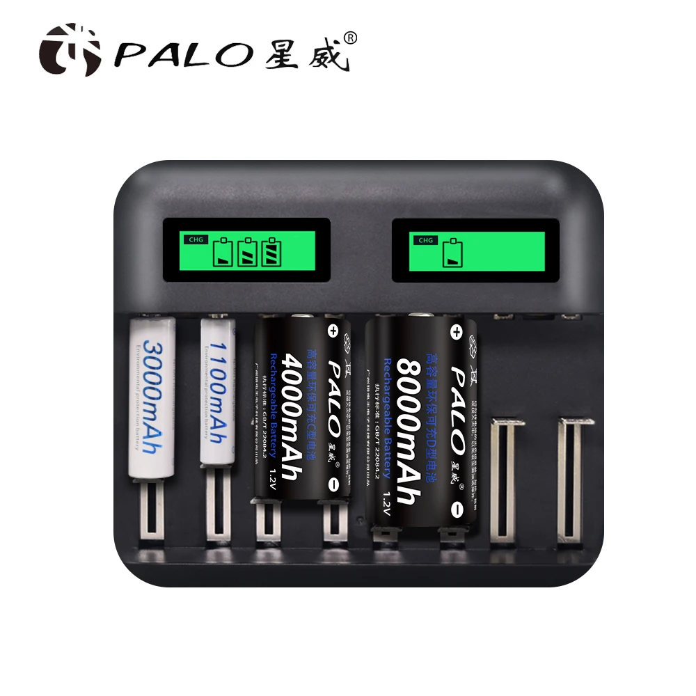 Palo C D Size Battery Charger LCD Smart Charge for AA AAA SC C D Size Battery+4pcs 1.2V 8000mAh NiMH Rechargeable Battery D Size